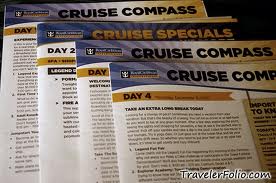 Hierboven zie je de Cruise Compass zoals je die dagelijks in je hut ontvangt bij Royal Caribbean.