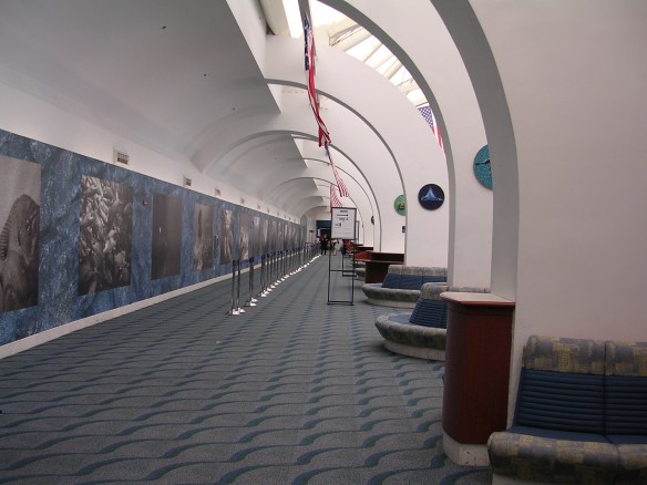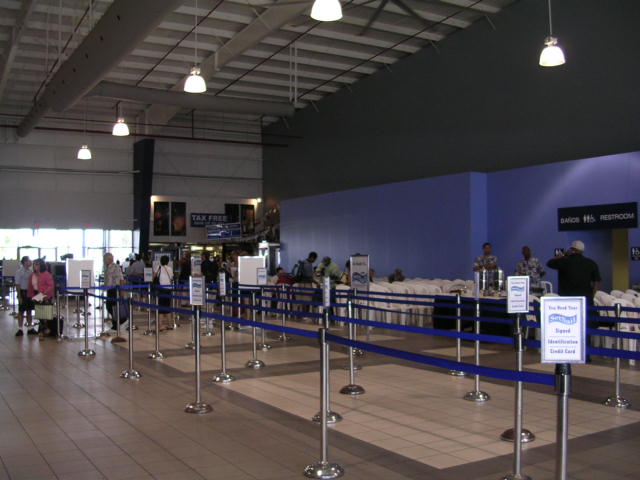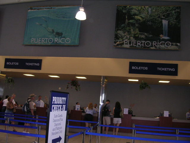 En de cruiseterminal van Royal Caribbean van binnen in Puerto Rico met hier beneden de incheckbalies.