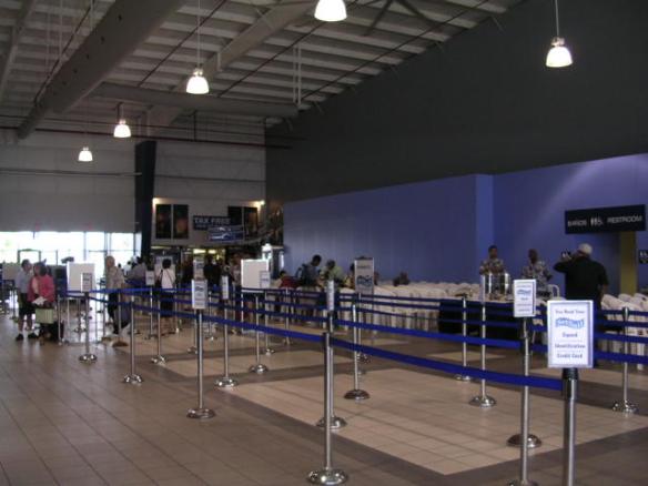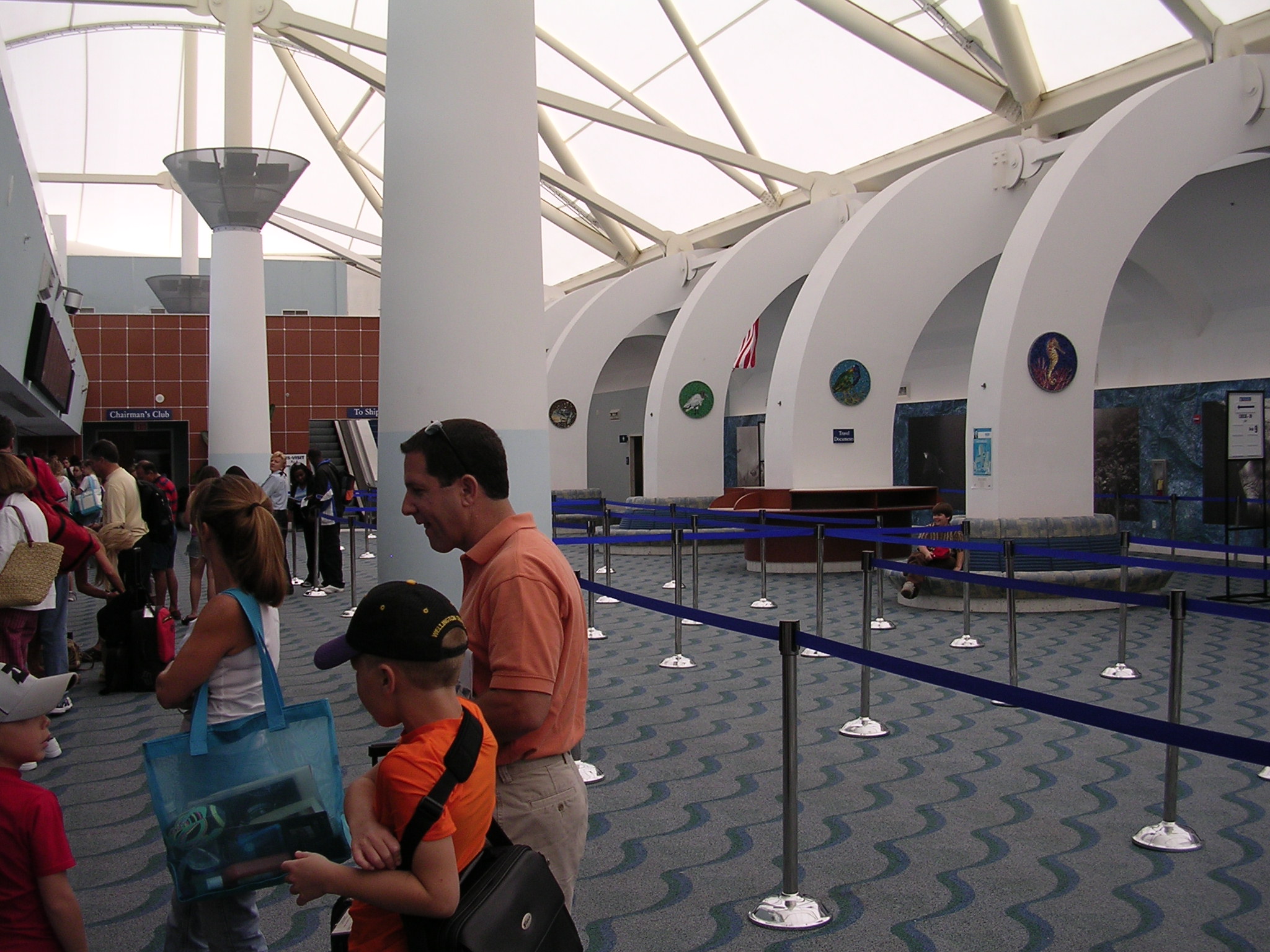 de mensen in Miami in de rij aan de diverse balies. Hoewel je met meer dan tien maal zoveel passagiers moet inchecken als bij een vlucht met een Boeing 747, verloopt het inchecken vele malen sneller!