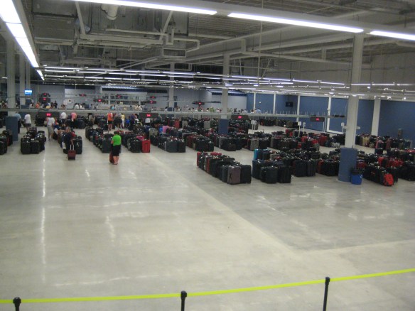 Aan alle goed dingen komt een eind dus helaas ook aan je cruise. De laatste avond moet je de koffers inpakken en voor een bepaald tijdstip buiten, voor je hut, op de gang zetten. In de loop van de avond/nacht worden die allemaal opgehaald en klaar gezet om ze in alle vroegte, bij aankomst in de haven, snel van boord te kunnen halen. Afhankelijk van hoe laat je vlucht gaat, krijg je een vroeg vertreknummer of een later vertrektijdstip (dat staat op de labels die je de avond van te voren in je hut worden neergelegd). Per nummer/tijdstip moet je je op een vooraf afgesproken plek aan boord verzamelen en als het tijd is, verlaat je het schip. Je komt dan uit in de terminal in een hele grote hal, waar duizenden koffers staan. Dankzij een overduidelijke kleurcodering is het een eitje om de juiste koffers snel terug te vinden.