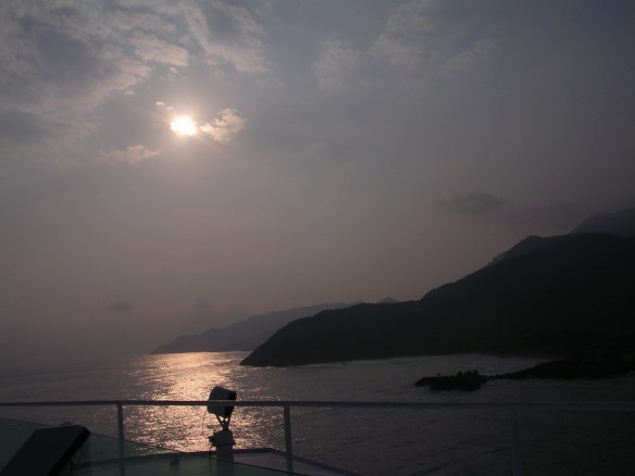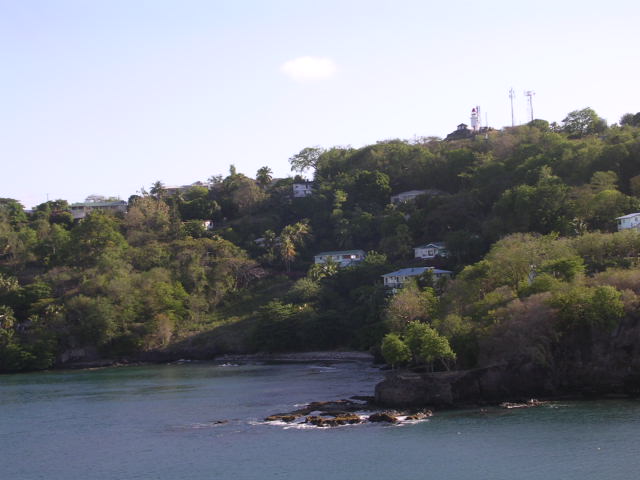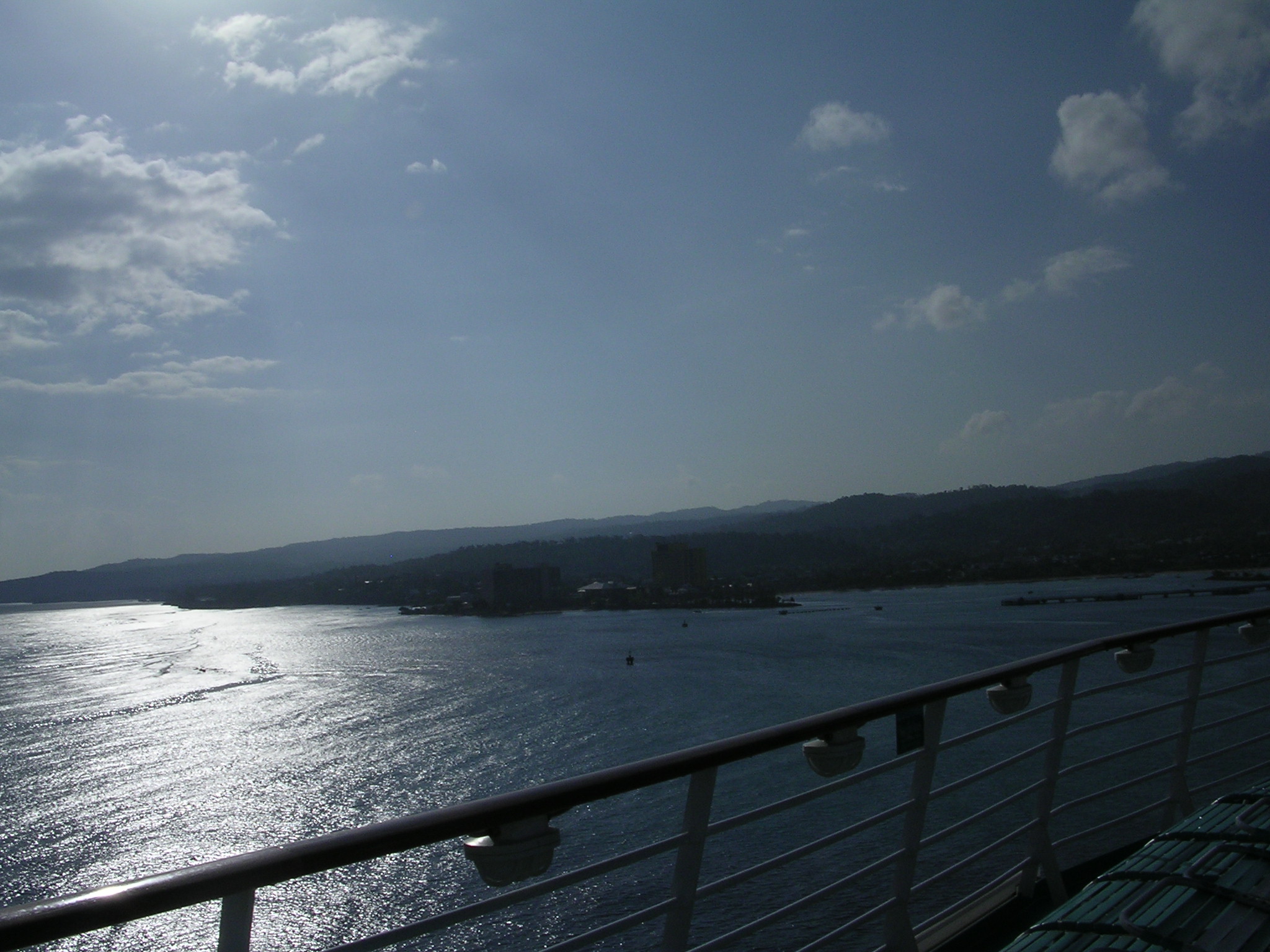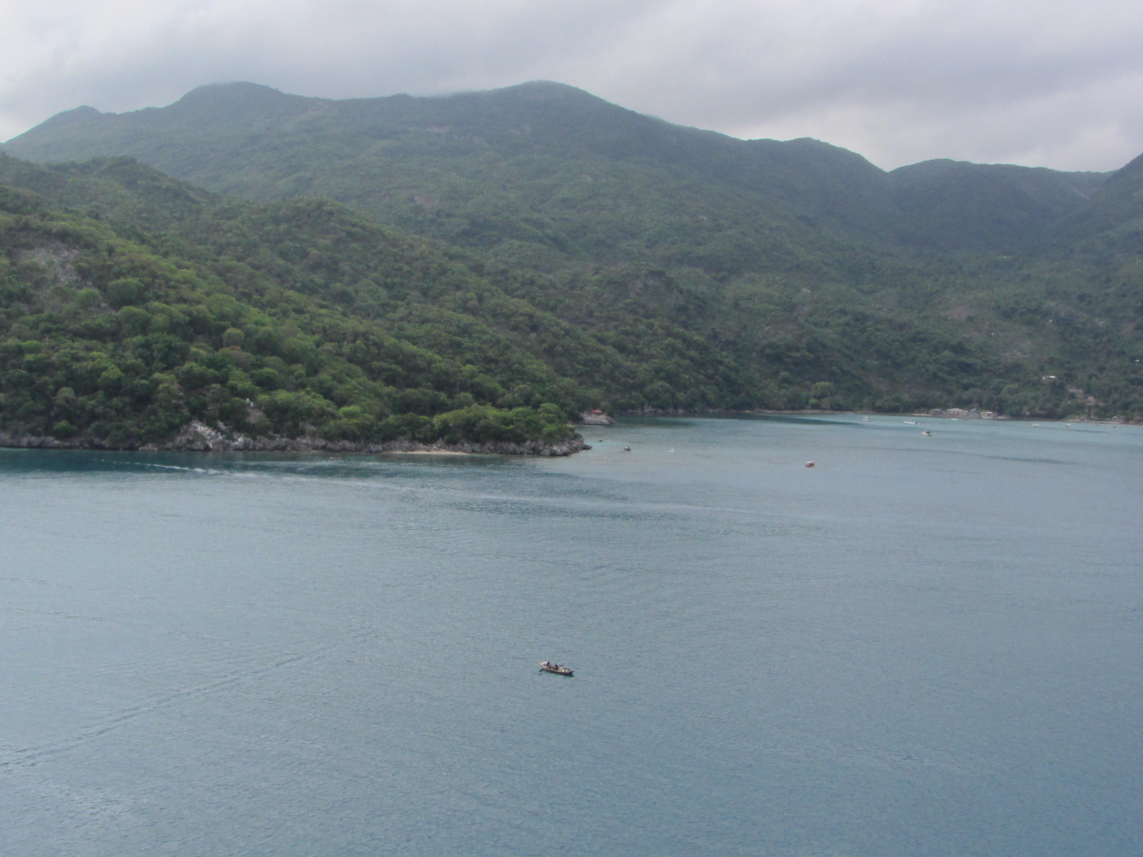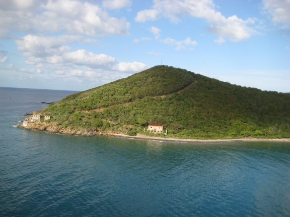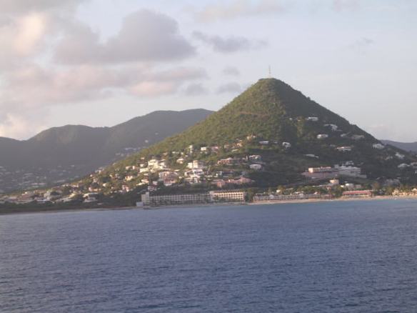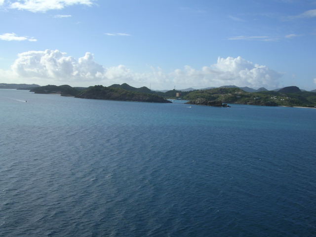 Allereerste blik op het eiland vanaf het schip bij aankomst
