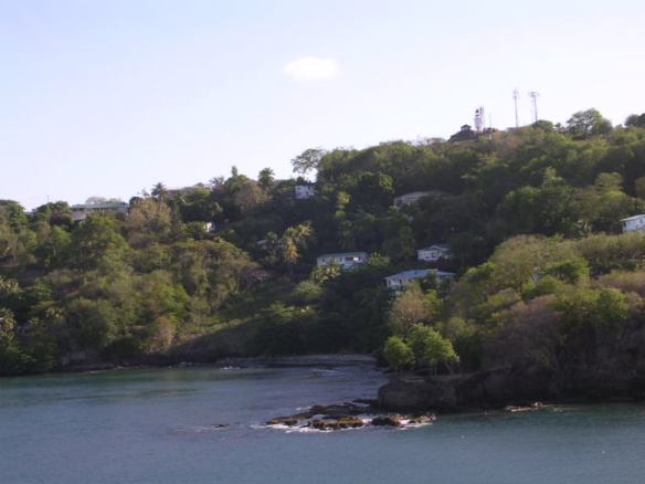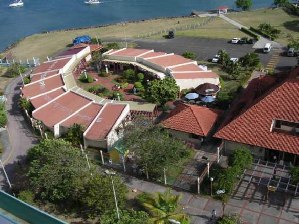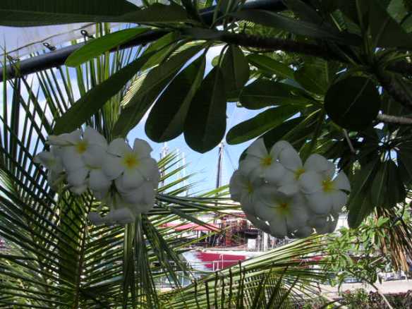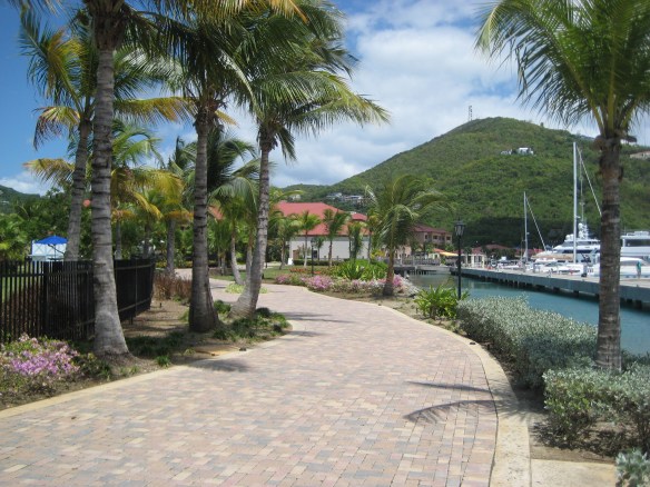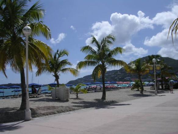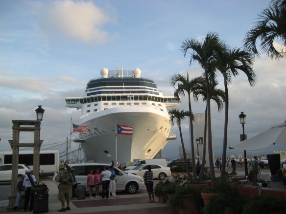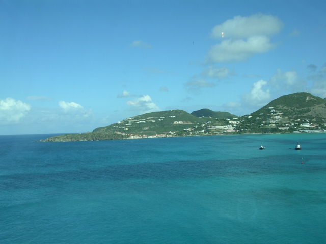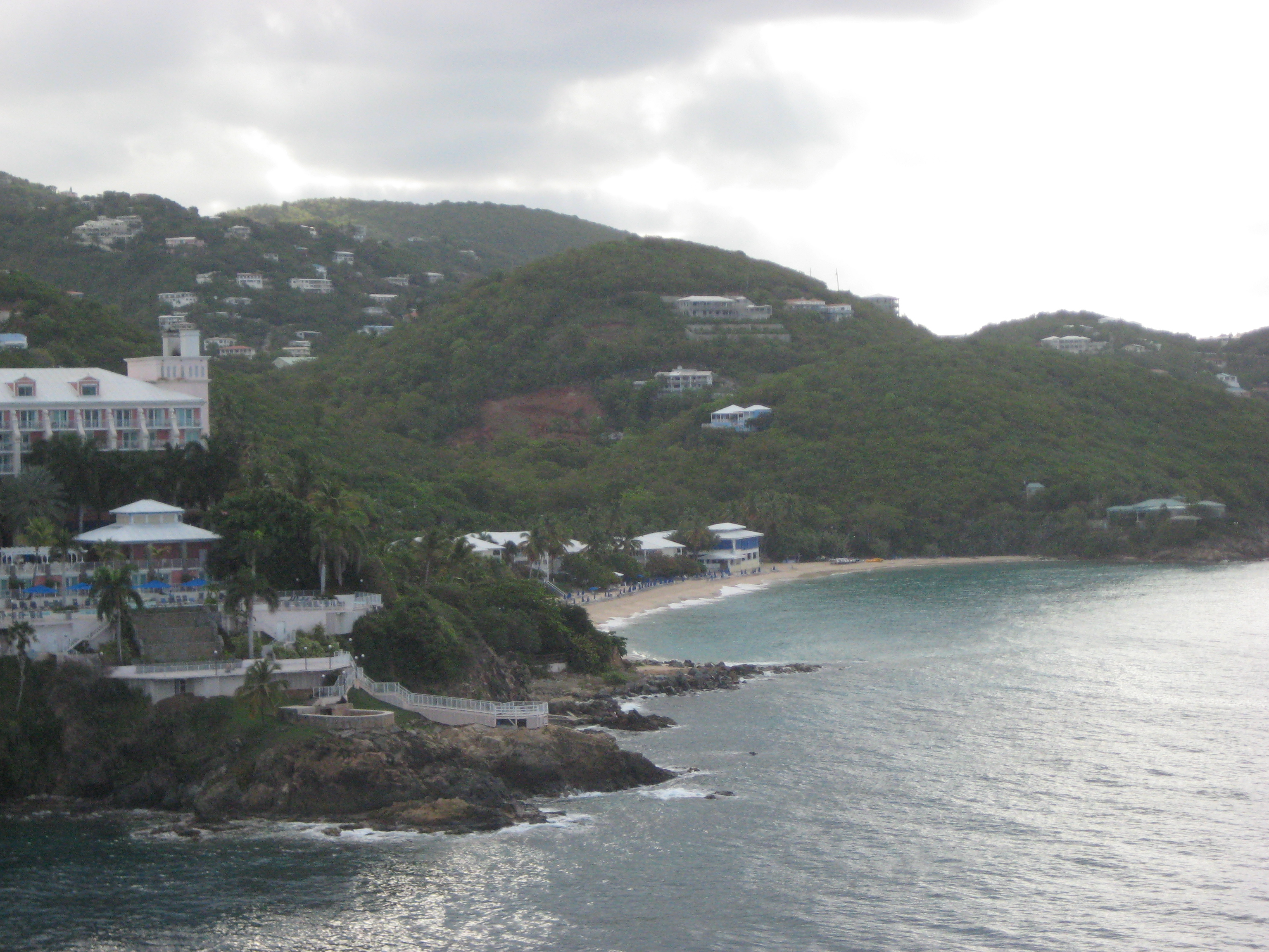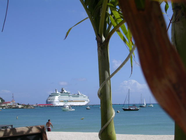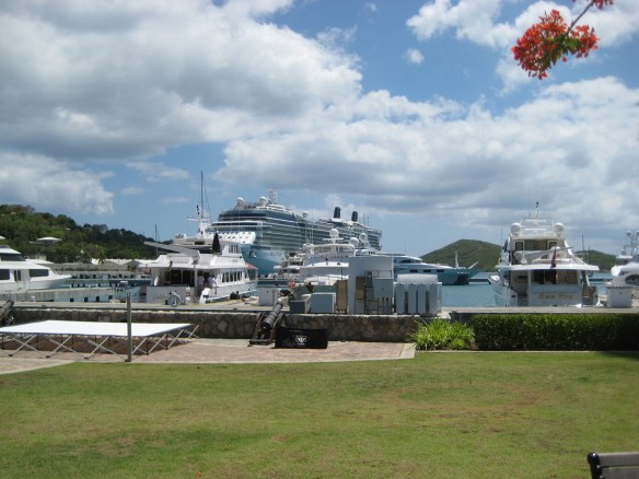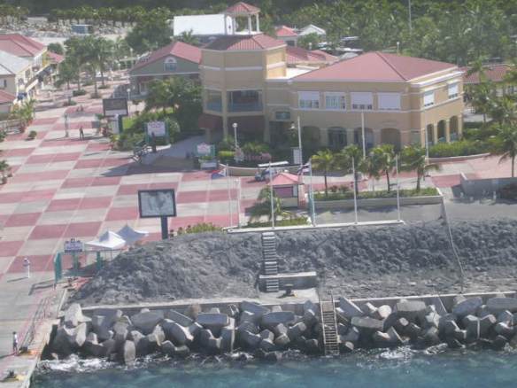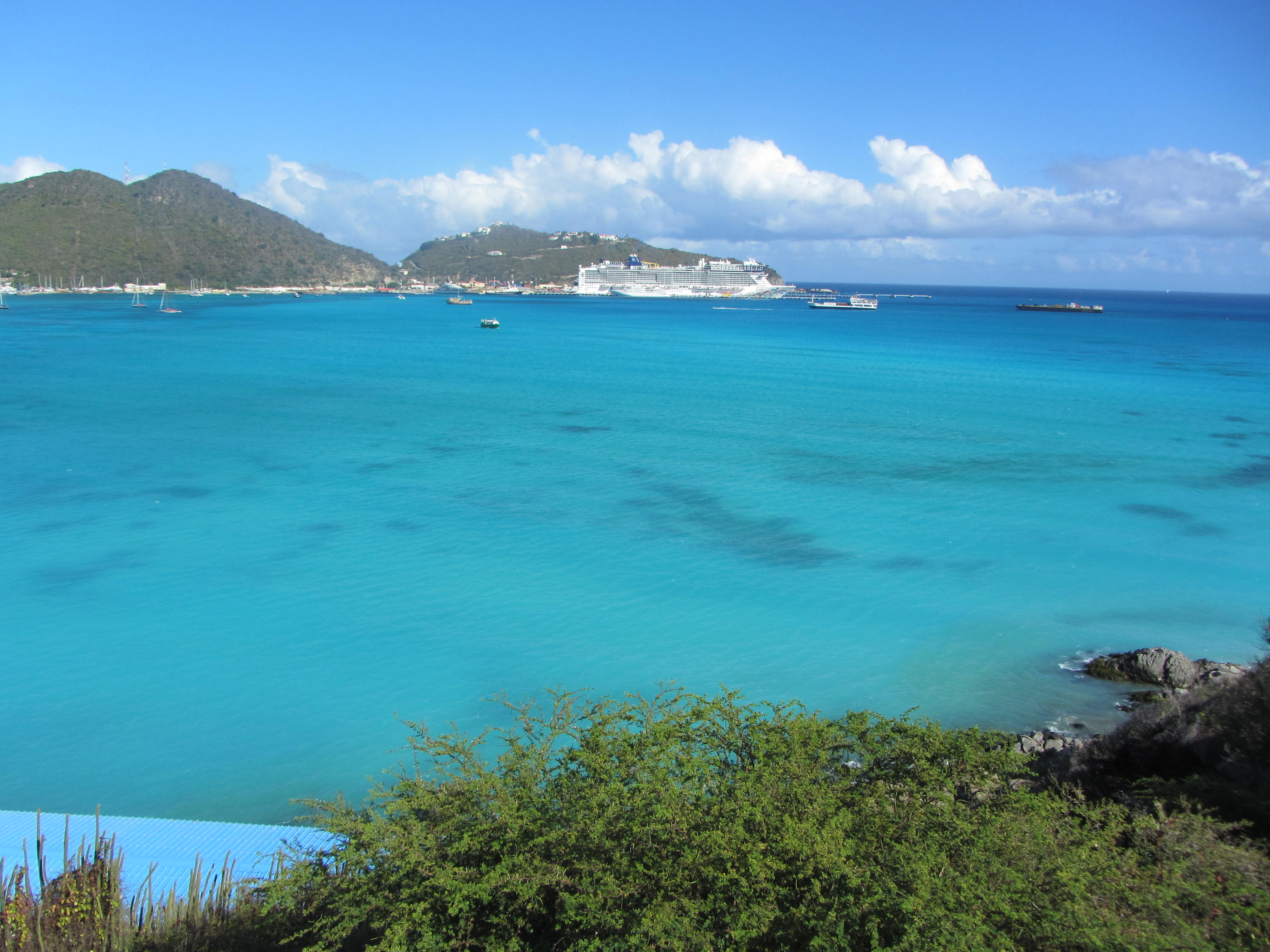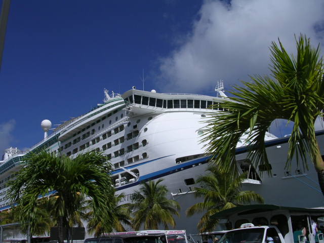 Prachtig gezicht, het witte van het schip tegen die felblauwe lucht en het groen van de palmen…Hier ligt ze aan de kade in Charlotte Amalie