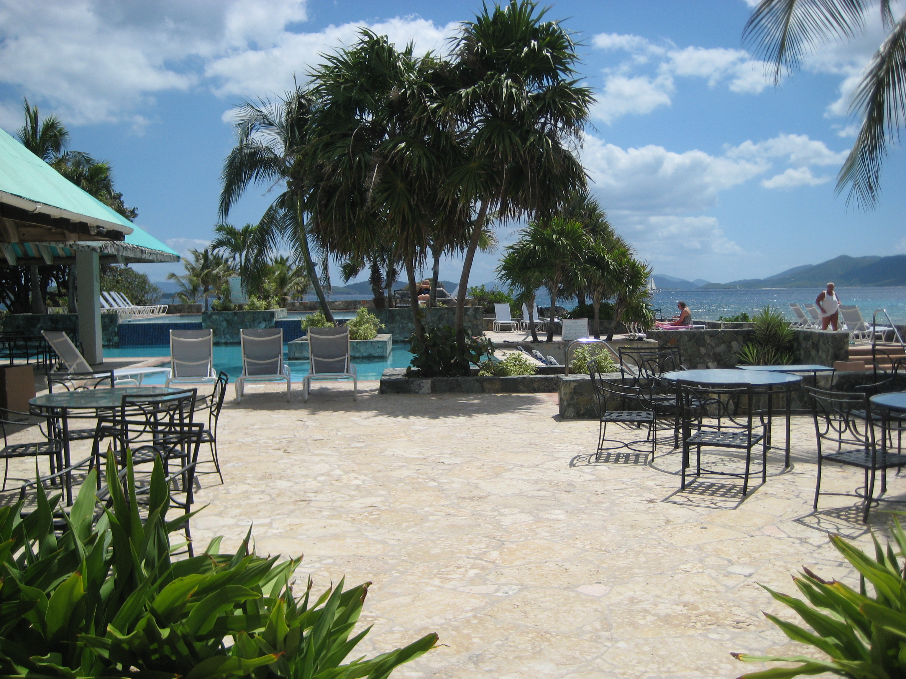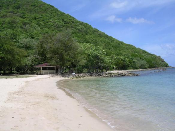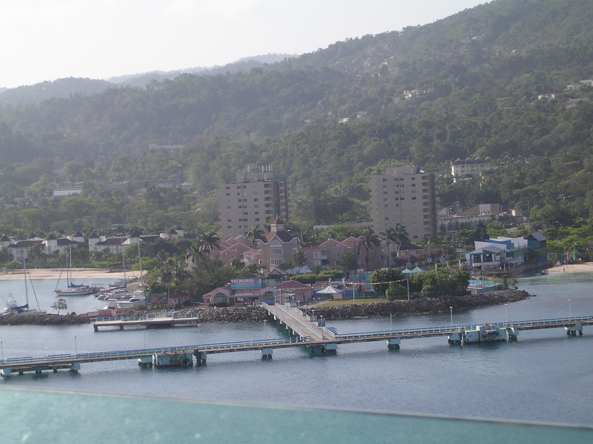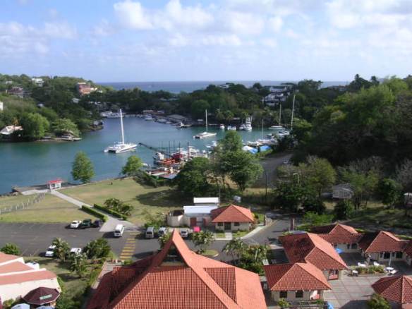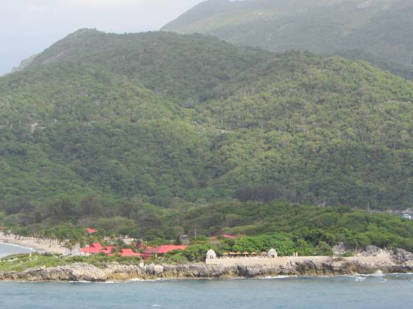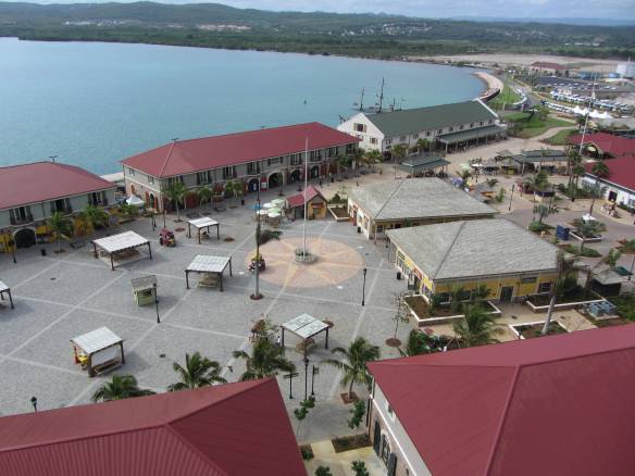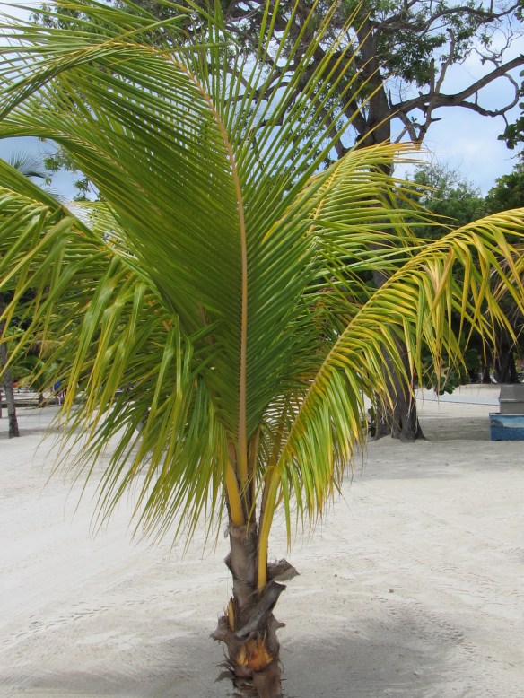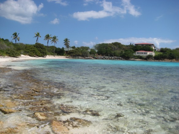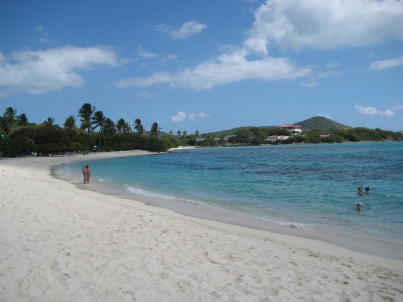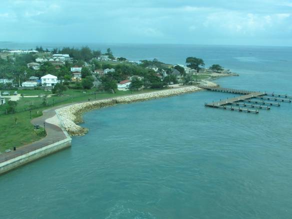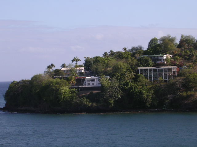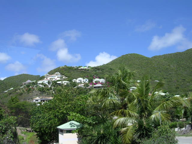 Prachtig gezicht, het witte van het schip tegen die felblauwe lucht en het groen van de palmen…Hier ligt ze aan de kade in Charlotte Amalie