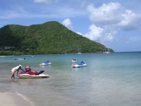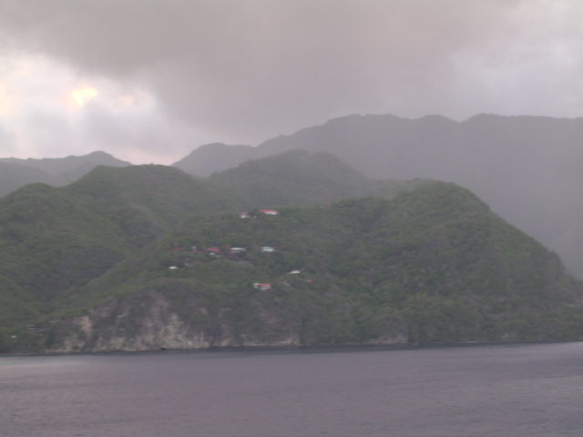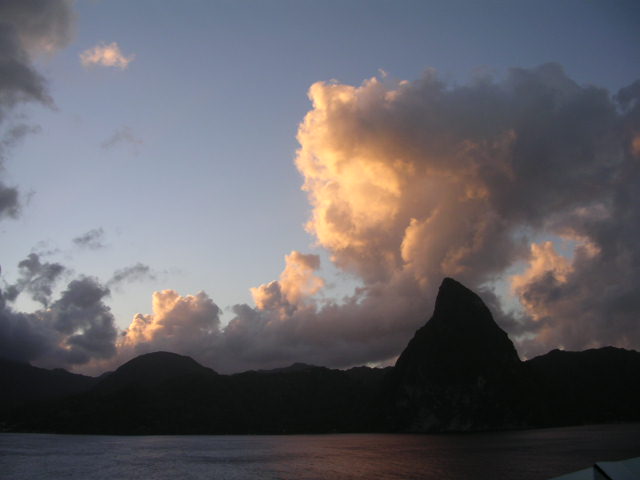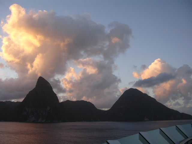 Hier zie je de twee beroemde rotsen die omhoog rijzen uit de Caribische zee, “Les Pitons”, bij het ochtendgloren op weg naar St Lucia (wel moeten opstaan om 05.00 u ’s ochtends maar zeer de moeite waard!)