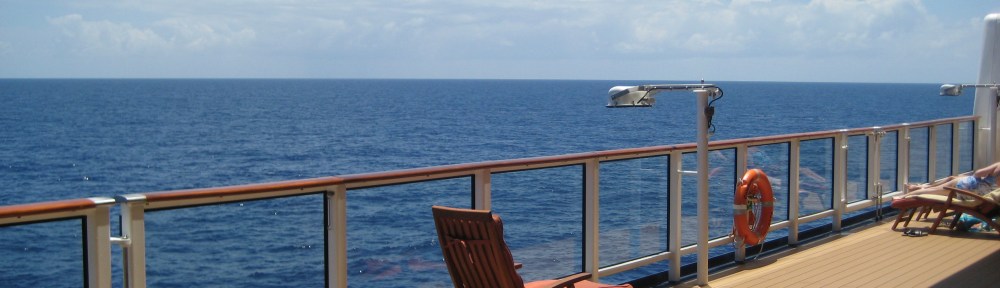Als ik tegen de middag nog steeds niet doodziek ben, besluit ik samen met H. aan dek te gaan op de 12e verdieping om eens te kijken hoe hard het nu eigenlijk echt waait. Meteen nadat ik een voet buiten heb gezet, word ik bijna omver geblazen. De wind rukt woest aan mijn kleren en blaast mijn haren alle kanten uit. Het gierende geluid overstemt alles zodat ik moet schreeuwen om verstaanbaar te zijn. Als ik over de reling kijk, zie ik dat het schip eerst behoorlijk daalt om daarna weer flink te stijgen ten opzichte van de horizon. Het water in het zwembad wordt zo hoog opgezwiept dat het bij tijd en wijle aan alle kanten over de rand slaat. De regen geselt het dek. Af en toe is er zo’n felle rukwind dat ik, zonder iets te doen, een stukje vooruit geblazen word. Tegen de wind in lopen, kost me echt moeite. Ondanks al dit geweld is het aangenaam warm buiten. Een vreemde gewaarwording.