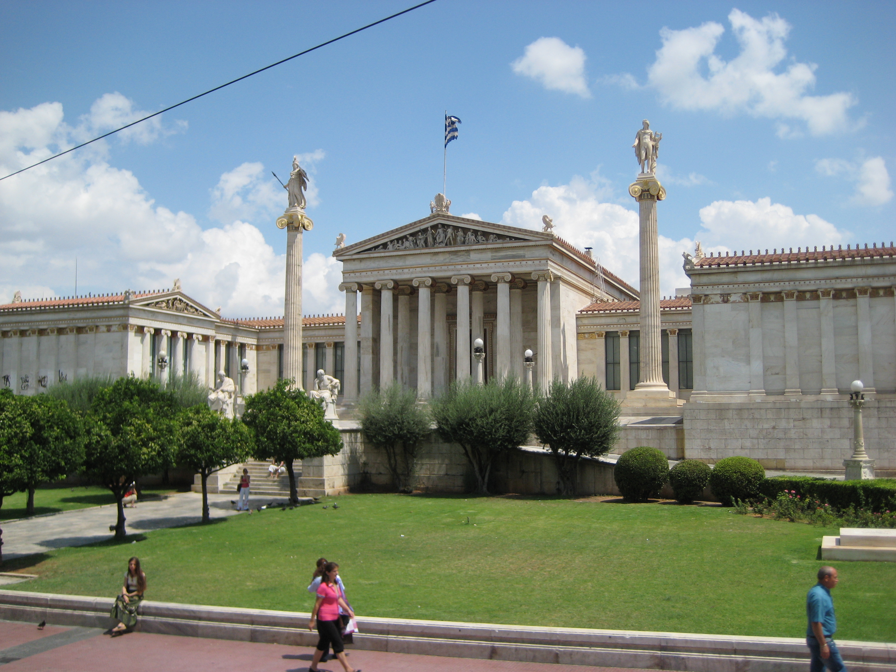 De Academie, met links op pilaar Plato en rechts Socrates