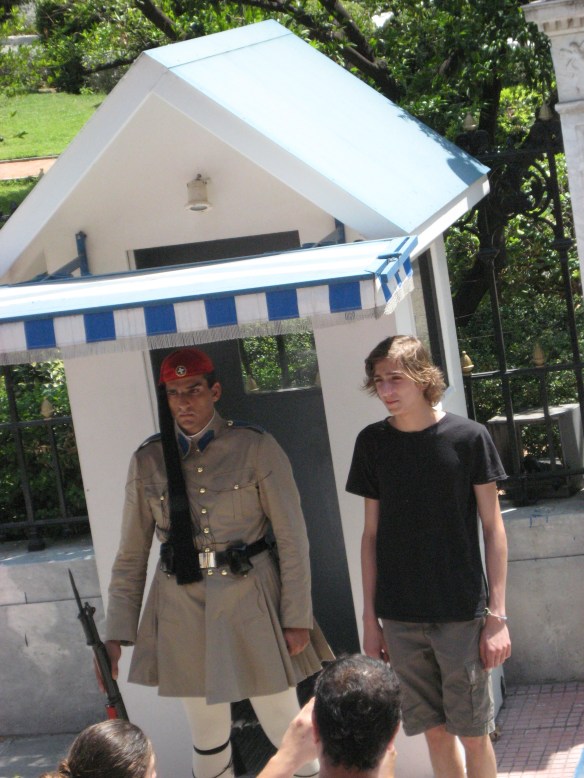 Deze jongen imiteert de Evzone-wachter die voor het parlement op wacht staat