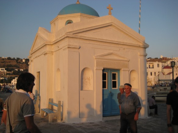 Mykonos, Griekenland Het eiland behoort tot de Cycladen, is 85 vierkante kilometer groot en telt ongeveer tienduizend inwoners. Het is, net als Ibiza, bekend als party-eiland. Mykonos-stad is een pittoresk stadje met witte huisjes, kleine steegjes en de nodige kerkjes.