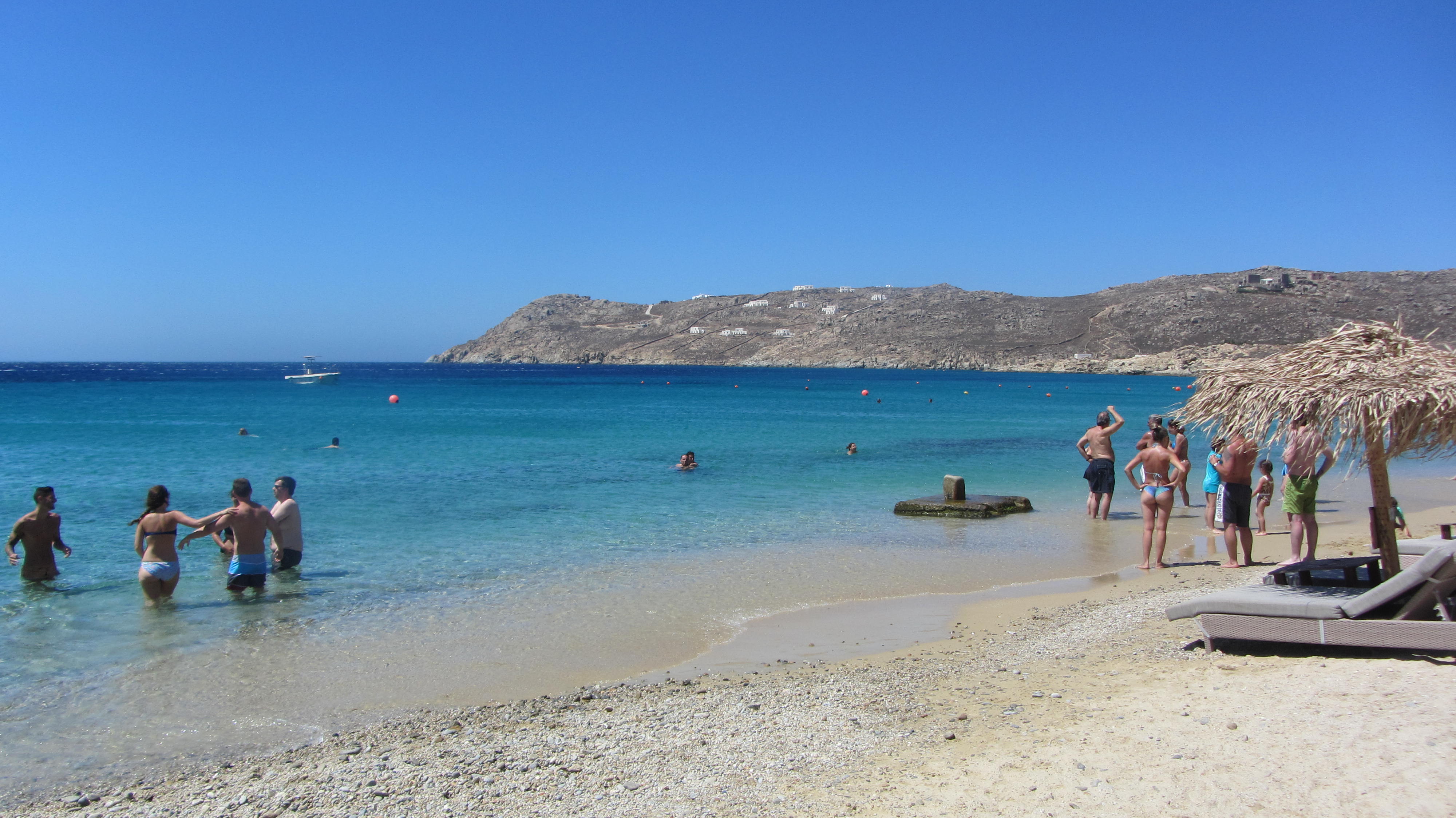Vulkanisch strand van Perivolos. Let op: het zand wordt echt gloeiend heet met die zwarte kleur, slippers verplicht!!! Het zeewater was er ijskoud!