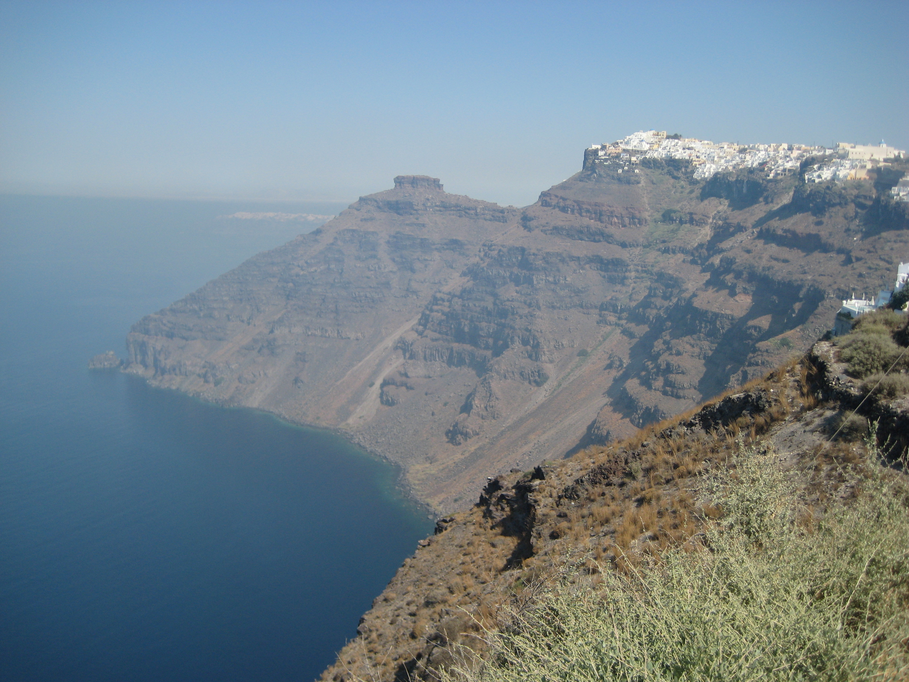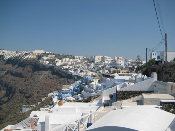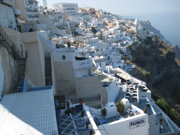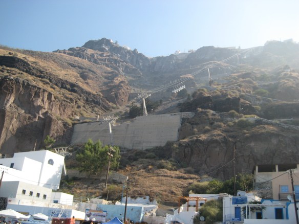 Santorini van onderaf gezien; te zien is de kabelbaan waarmee je naar boven kunt