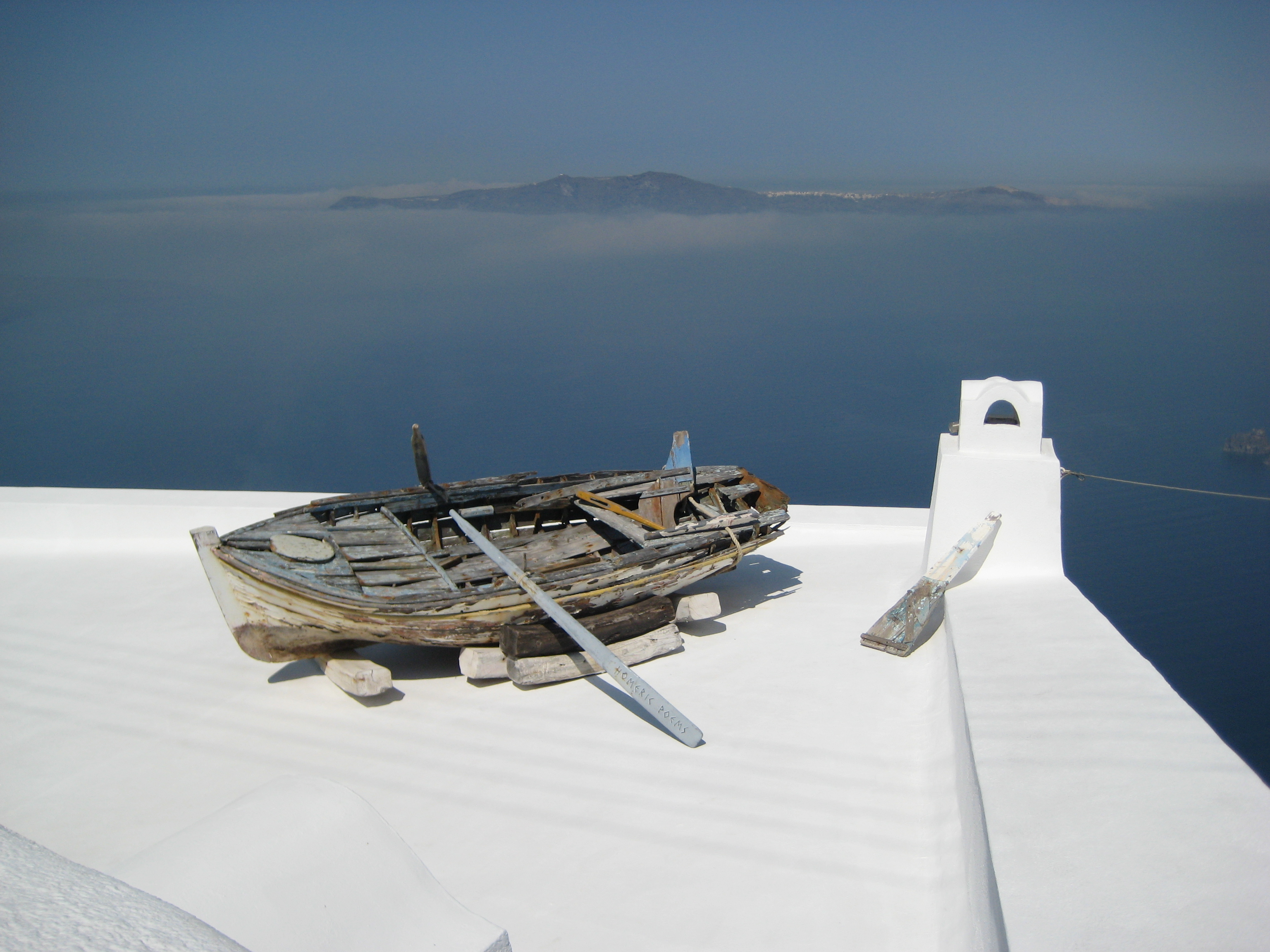 Surrealistisch plaatje van rustiek bootje (dat zo te zien niet meer zeewaardig is)