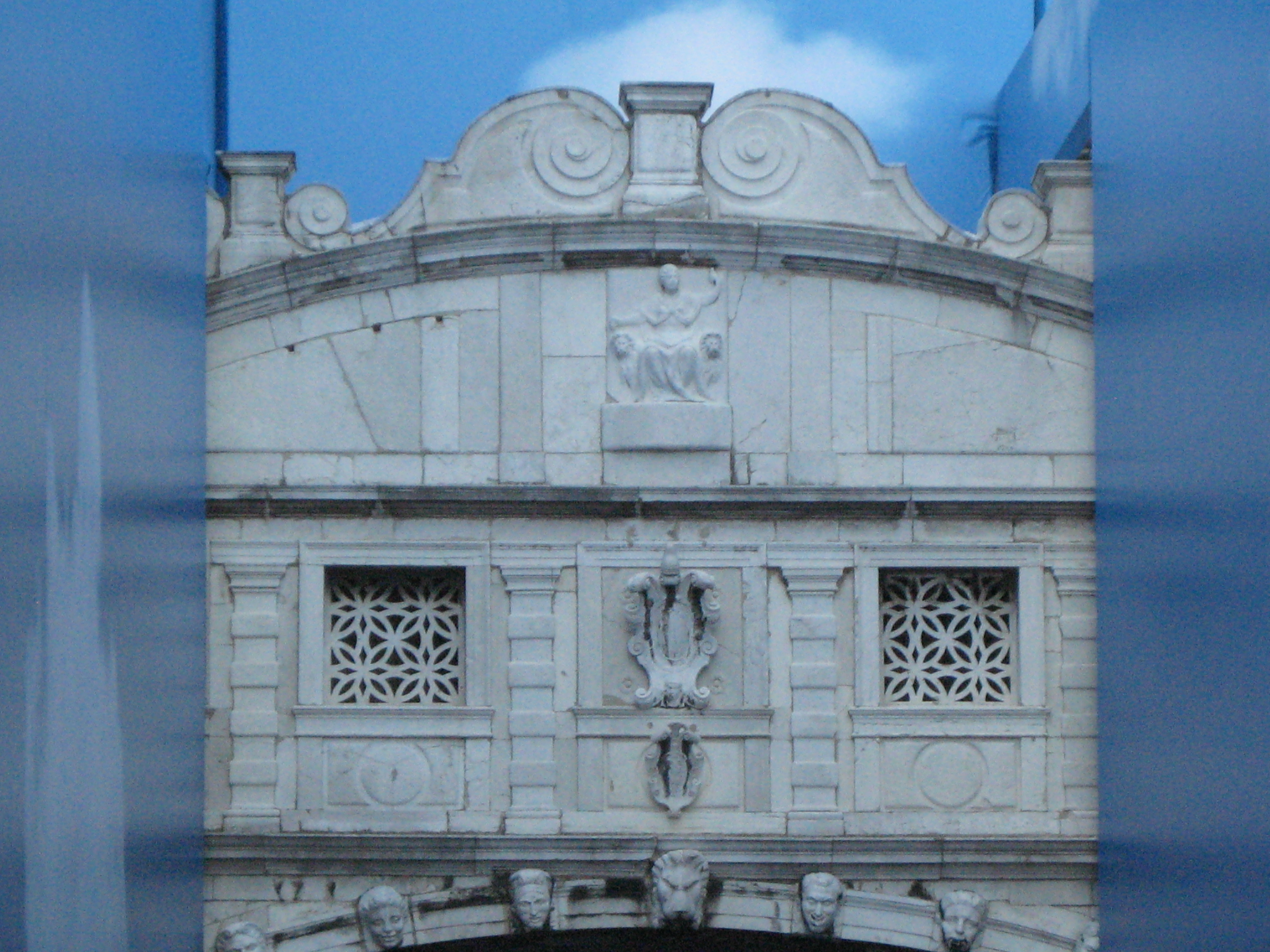 Detailopname van de beroemde ponte dei sospiri oftewel de brug der zuchten, waar de gevangenen een allerlaatste blik op de stad konden werpen voordat ze langdurig werden opgesloten