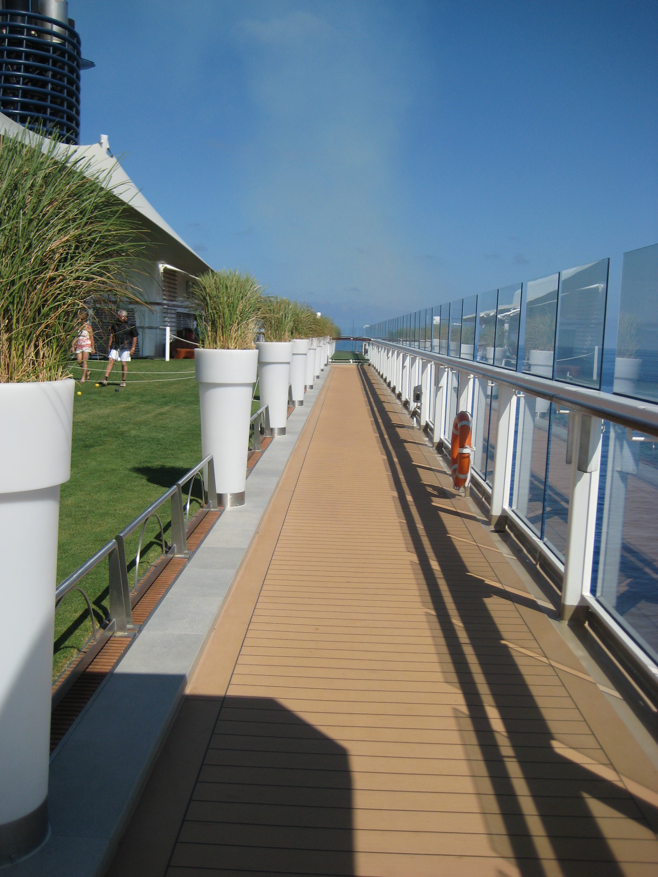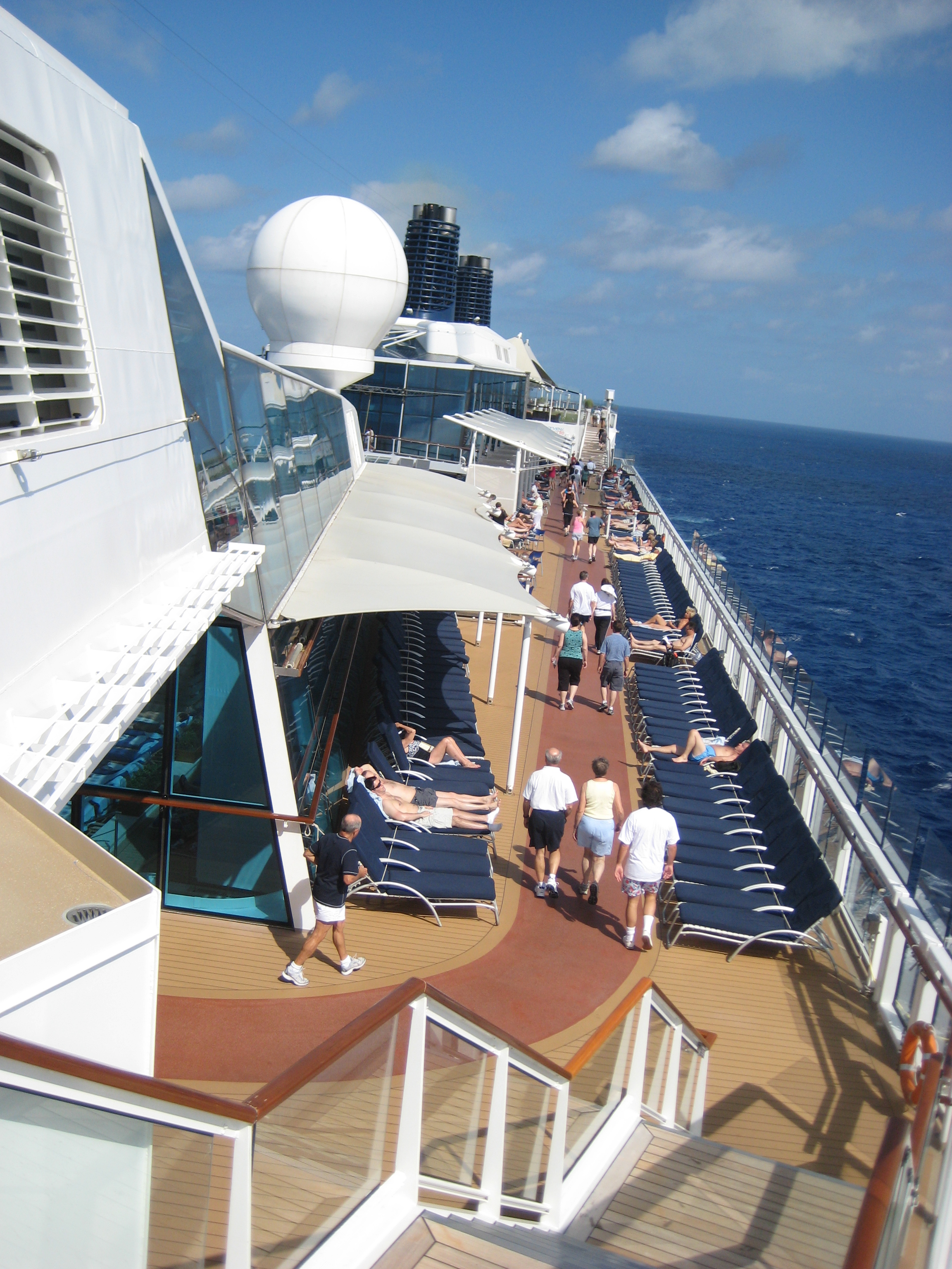 Een deel van het schip waar je overdekt kunt rondlopen op een van de lagere dekken