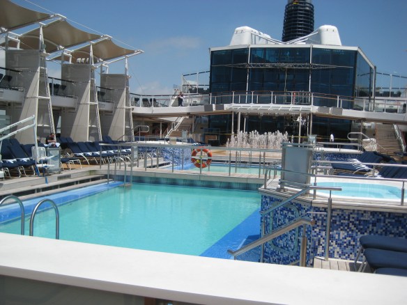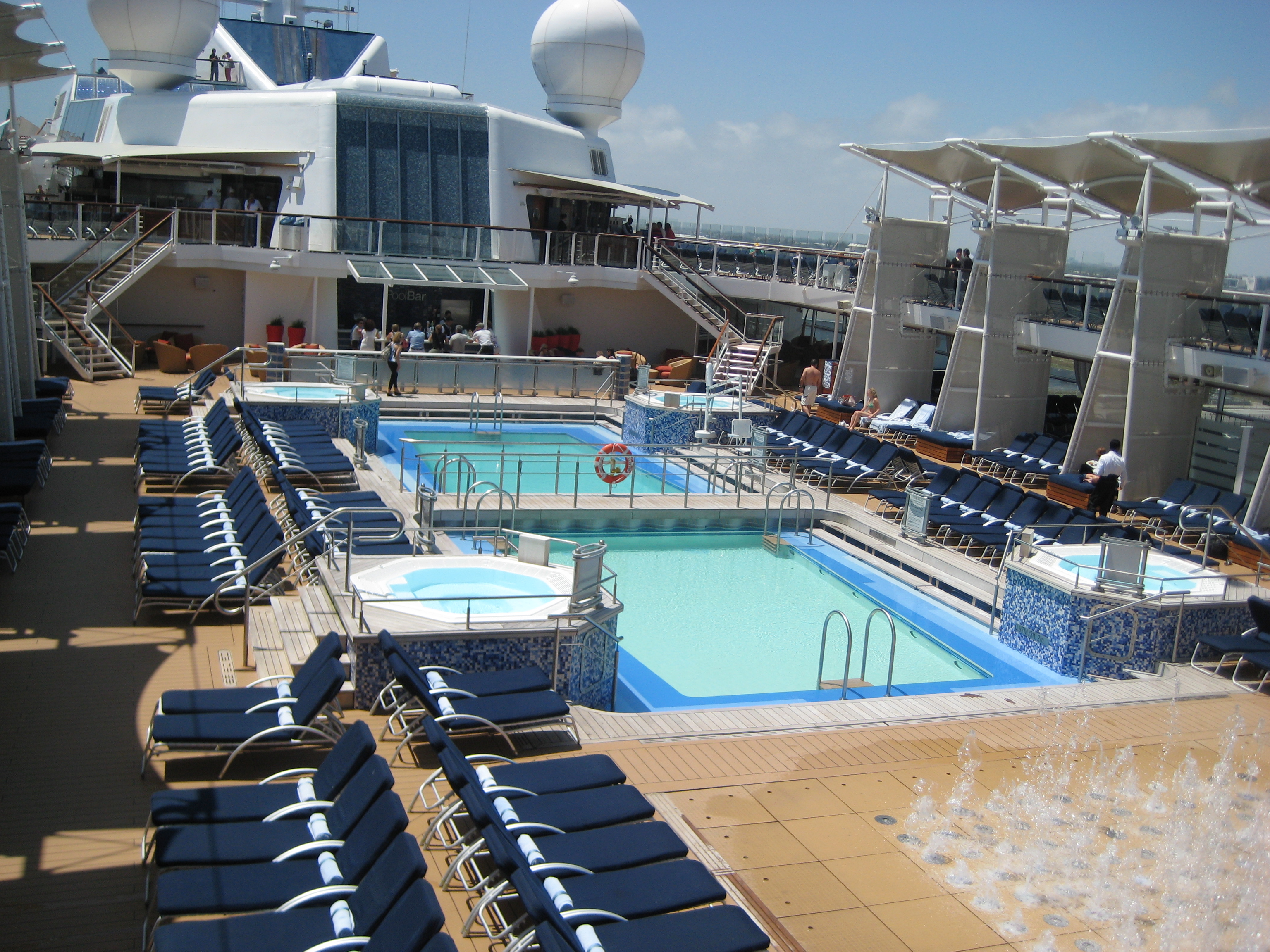 Zo heb je meer overzicht over het zwembaddek en zie je de beide zwembaden, de jacuzzi’s en een deel van de fontein.