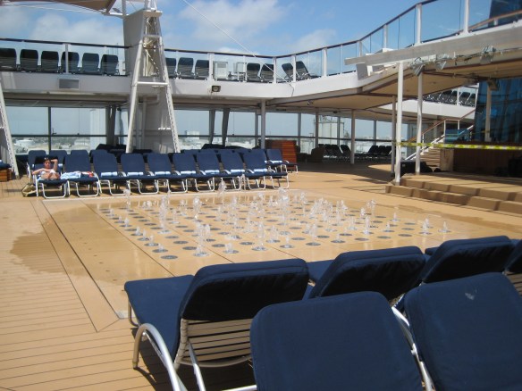 Zonnedek met fonteinen die onverwachts aan en uit gaan. Heerlijk om even tussendoor af te koelen.