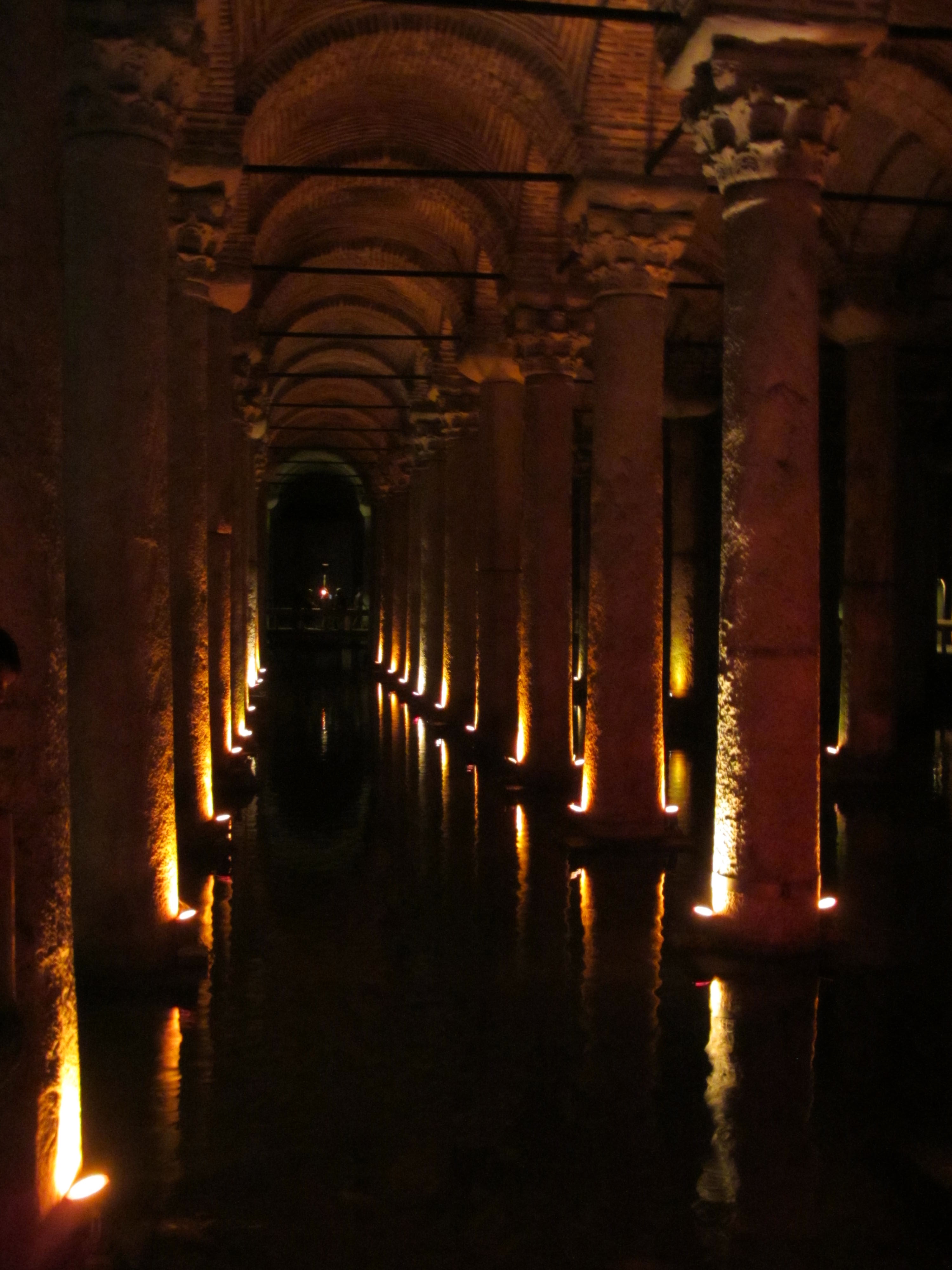 Volgende stop is het ondergrondse waterreservoir, een enorm complex bestaande uit 336 Corinthische zuilen waartussen zich water – compleet met grote vissen – bevindt. Een en ander wordt sprookjesachtig verlicht door mooie geel-oranje lampen, waardoor het een feeëriek geheel wordt. Heel bijzonder, zo in hartje Istanbul.